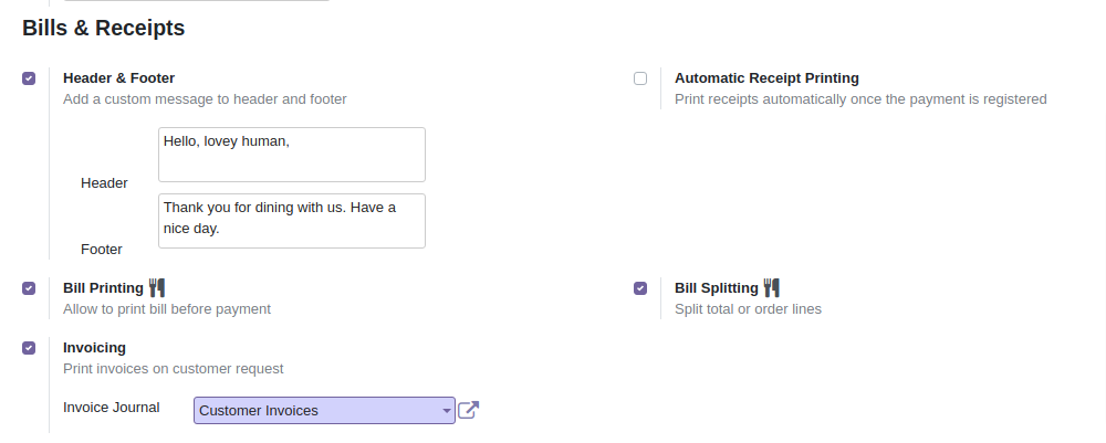 - Like adding HEADER & FOOTER in your bill. BILL SPLITTING in case some customers want to split bills and pay only for the items they have ordered individually, BILL PRINTING as we want to provide the bill to our customer before they pay, that’s the standard , and invoicing in case a customer asks for the invoice.