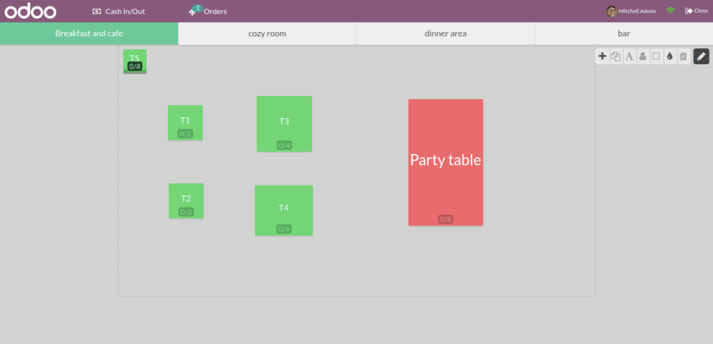 - Here a different screen is available depending on the area that you have mentioned before. Like here for me it is Breakfast & Cafe, cozy room, dinner area and bar. You can create a different layout for each of this area to get an accurate birds eye view as per your restaurant or bar. You can see here I have created the tables as per my cafe table organisation. I have color coded the large table since it is pre-booked. I have also changed the name of the large table.