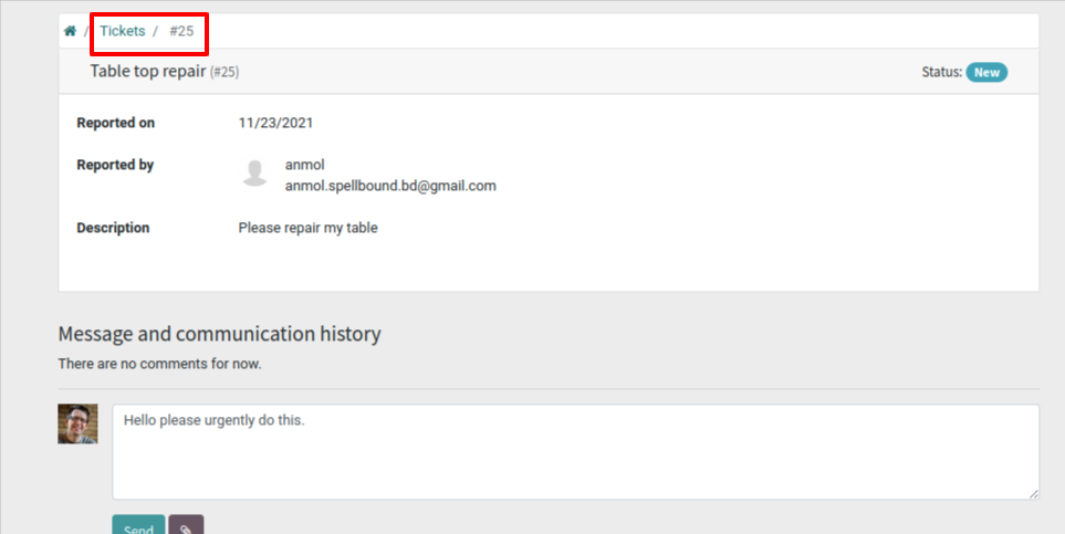 By clicking on your ticket number, a review of your ticket will open. You can also send a message from there.