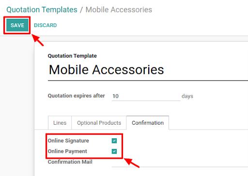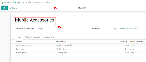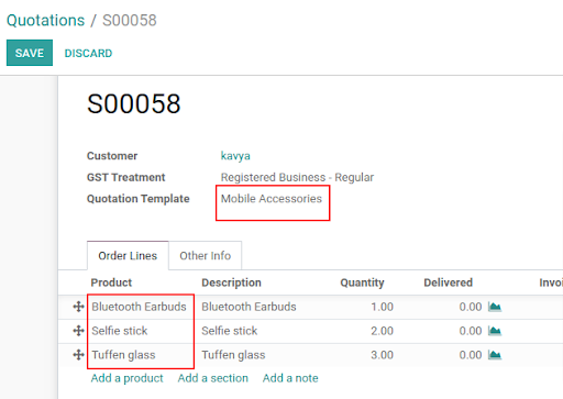 - Now as you select the mobile accessories in the quotation template, the template that you had previously created will be used and all the fields will be filled automatically as you can see.