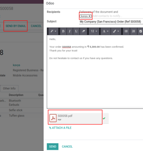 - By selecting send by email, a pop up with our customer that is Kavya’s information will come. The pdf for quotation is also attached. Let’s send it.